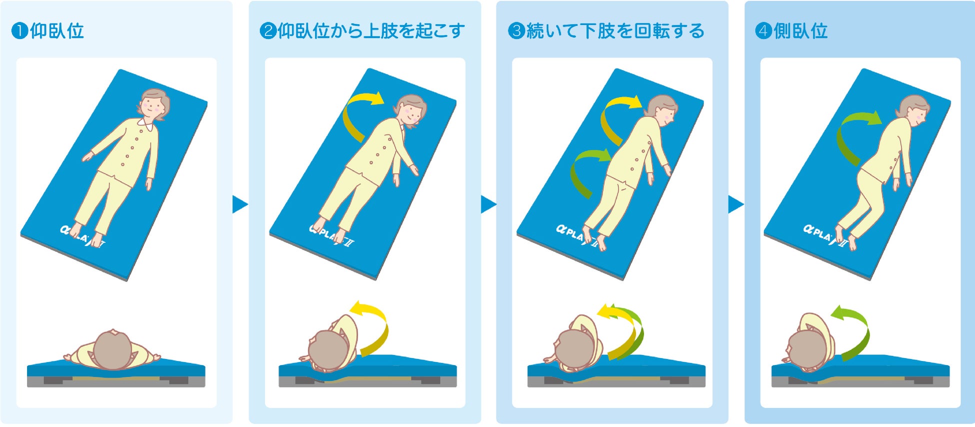 硬さや弾力の異なる素材を組み合わせた特殊構造により、寝返り時に必要な下肢の回転を「アルファプラ F」より容易に行うことができます。