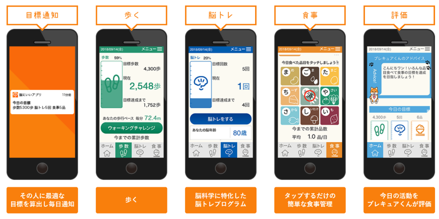今回の検証実証で使用する「脳にいいアプリ」は、脳科学に基づいて脳の健康維持に効果的と言われる「運動」「食事」「脳トレ」の機能を無料で提供しており、簡単に楽しみながら脳と体の健康管理が行えるサービスとなっております。