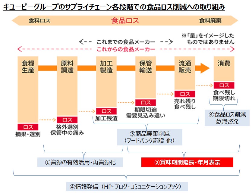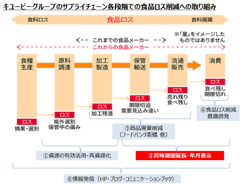 キユーピーグループは、事業を通じて取り組むべき社会課題を重点課題として特定し、それを指標とした「サステナビリティ目標」の一つに「資源の有効活用・循環」を掲げています。資源の有効活用・再資源化など、さまざまなアプローチを進める中、「賞味期間の延長」は、商品の製造後、保管・輸送から、流通・販売、消費までの各段階における食品ロス削減につながる取り組みです。
