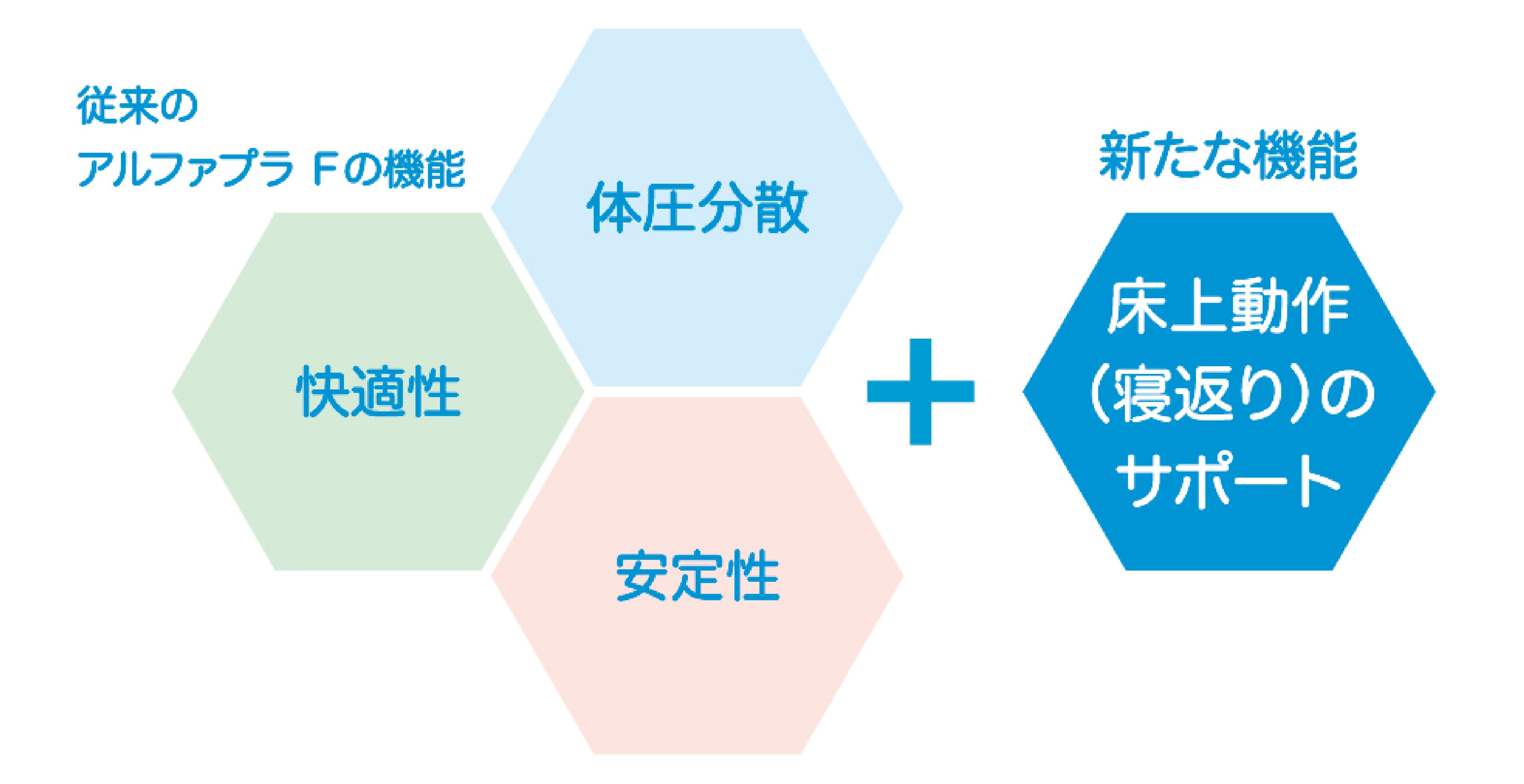 従来の「アルファプラ F」の体圧分散性能・快適性・安定性を保ちつつ、介助やご自身によるマットレス上での動きをできる限り妨げないような新たな機能を導入しました。自分で動く意欲を支え、寝返りをサポートするマットレスです。