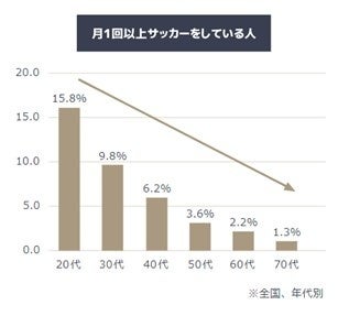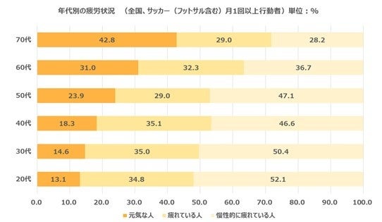 同調査において、サッカーをしている人に焦点を当てると、月1回以上サッカーをしている人は年齢とともに減少し、特に40代からの減少が顕著に表れています。年代別の疲労状況からは、サッカーをしている70代の42.8%は元気な人であるという結果があり、健康のために運動をするには「元気」でいることが大前提にあることがわかります。